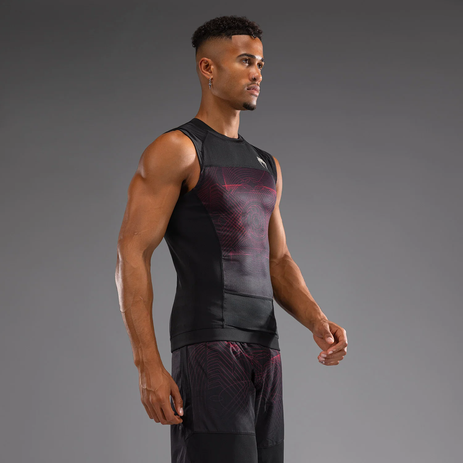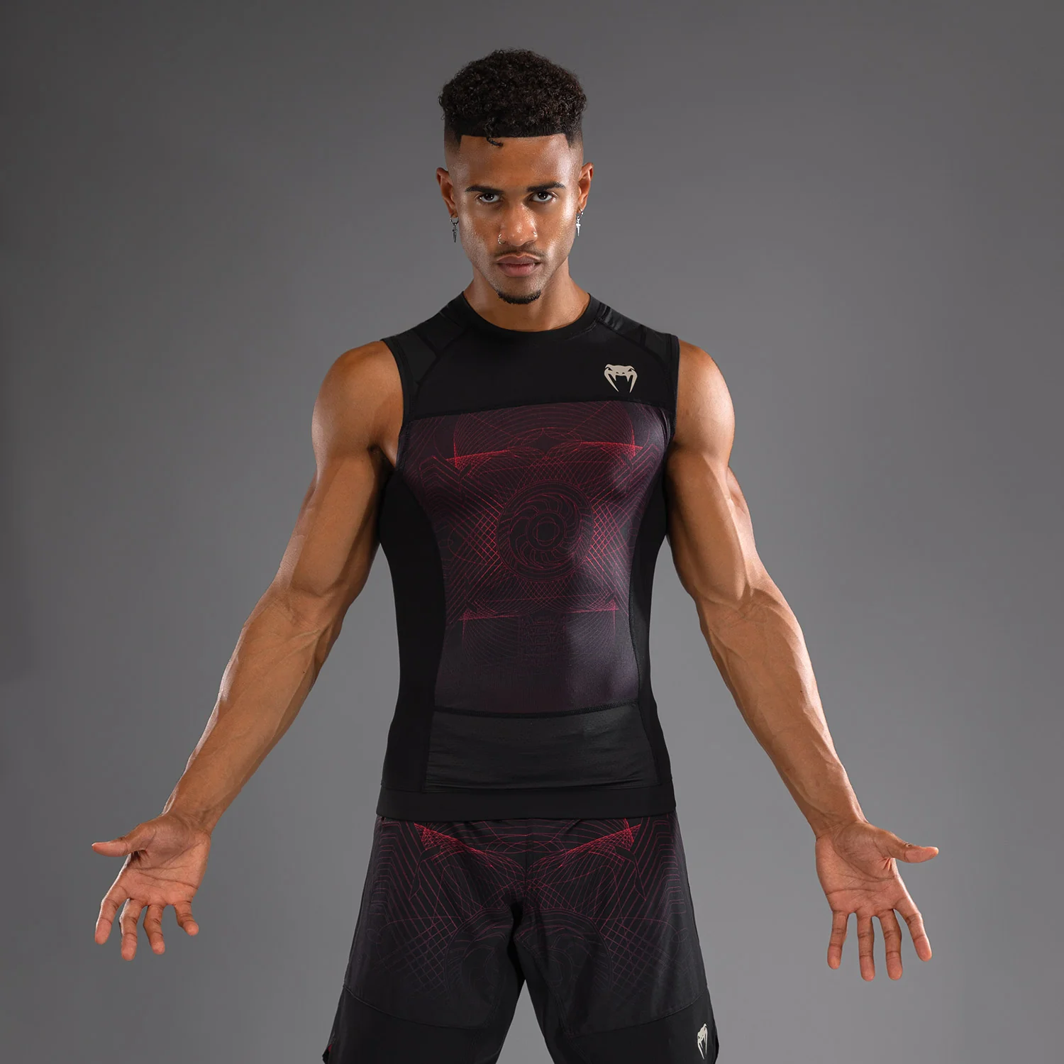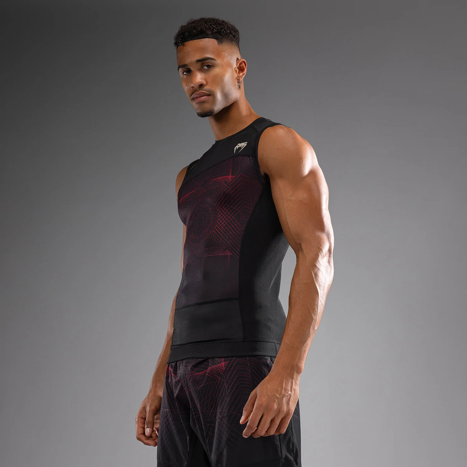 Il design moderno e sobrio del Rashguard Senza Maniche Venum G-Fit Air in Nero Profondo/Rosso Fuoco si abbina perfettamente ai pantaloni da combattimento e alle calze della stessa collezione.