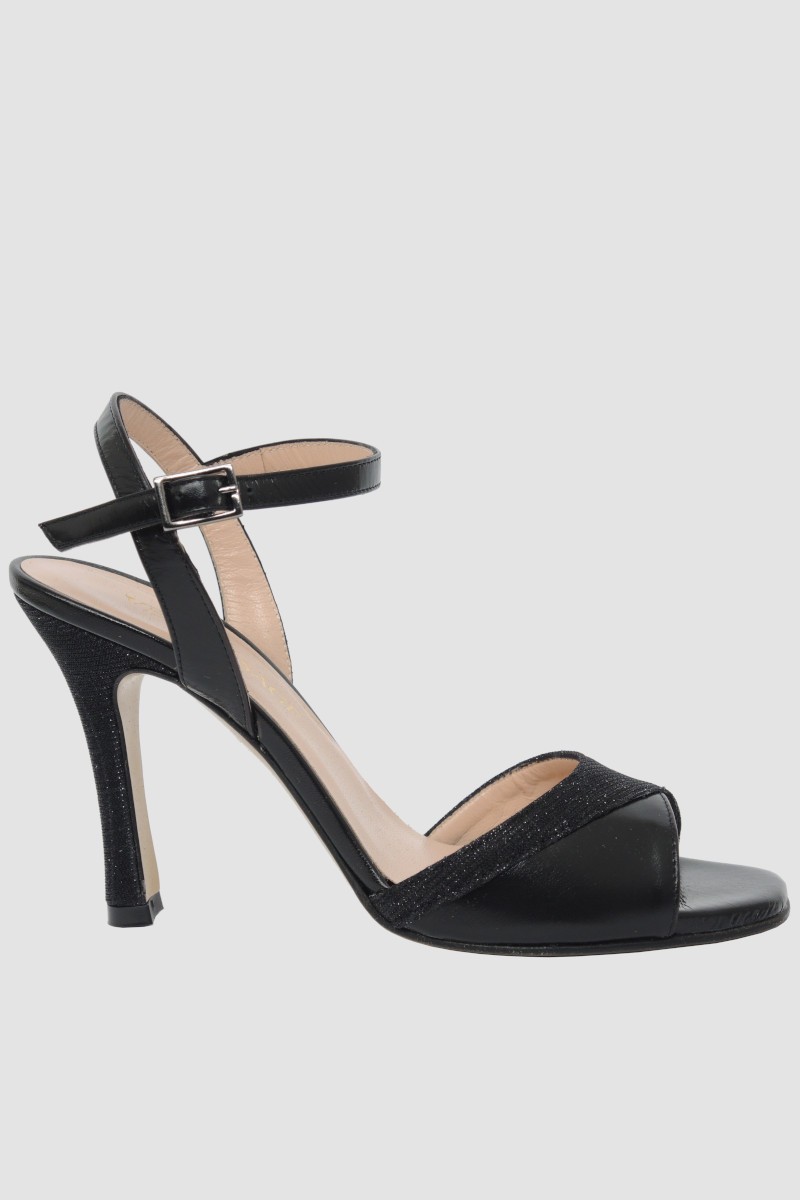 Sandalo cerimonia con tacco alto. Sandalo elegante Vernissage realizzato in pelle colorย Nero con dettagli in tessuto laminato. Sandalo tacco alto con cinturino alla caviglia.