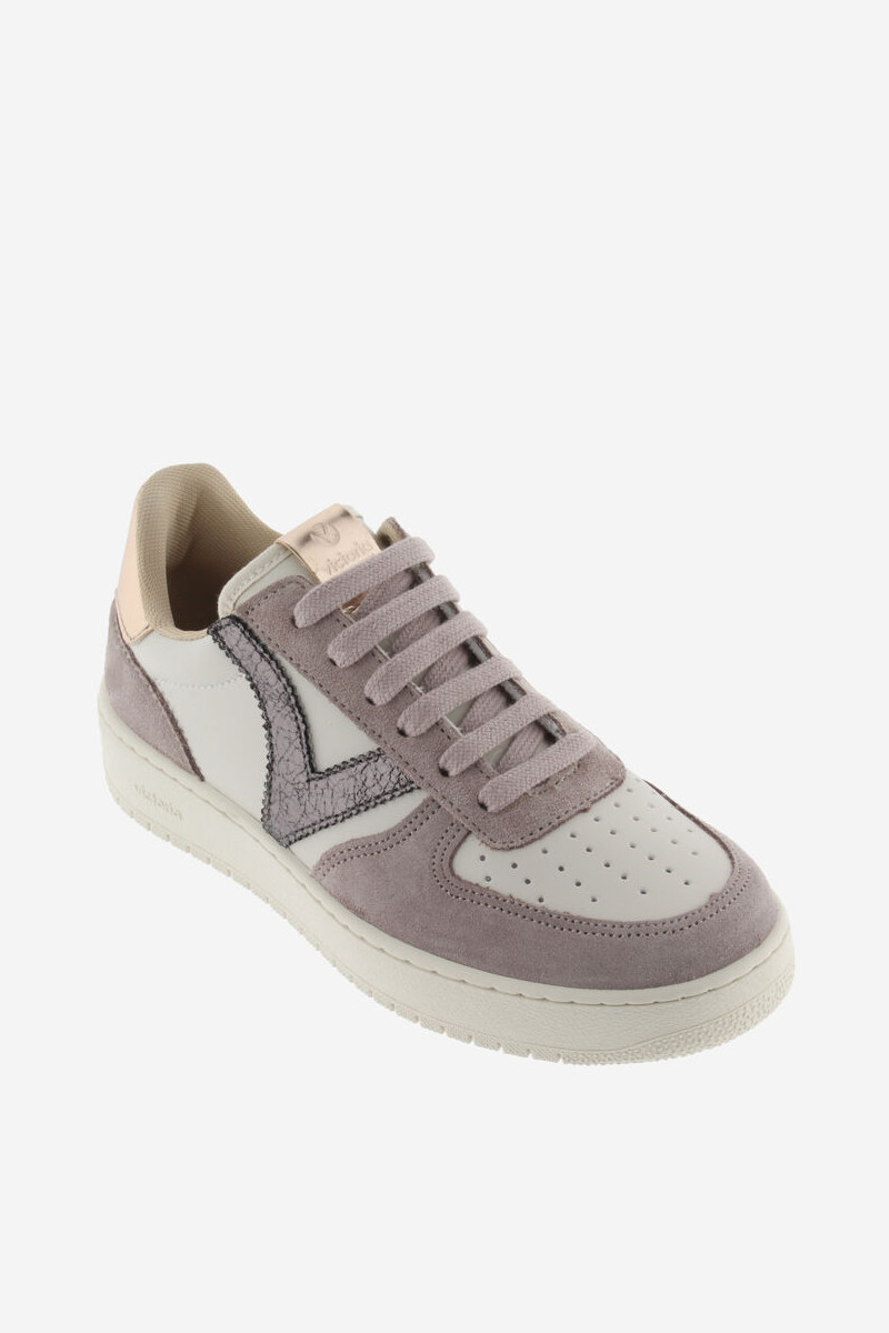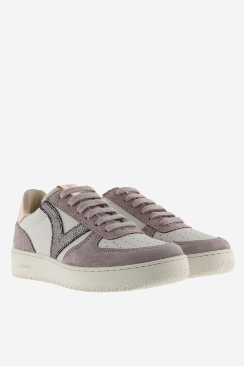 Sneakers da donna realizzate da Victoria in materiale effetto pelle e inserti in crosta di pelle. V craquelรฉ sul lato e dettagli metalizzati sulla parte posteriore e sull’etichetta della linguetta. Chiusura con lacci tono su tono. Suola di 3 cm composta da oli vegetali invece che minerali, riducendo cosรฌ l’impatto ambientale. Leggere, comode e traspiranti.