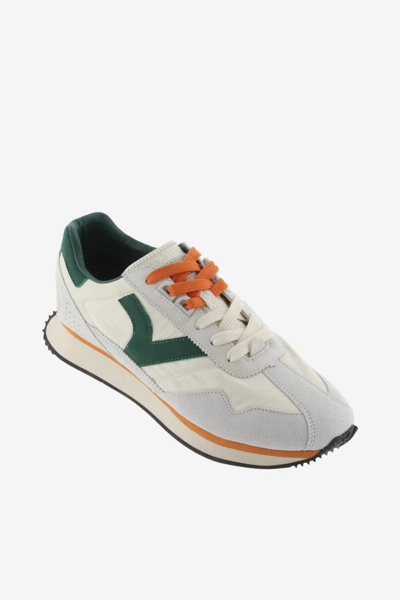 Sneakers da uomo in nylon con inserti sovrapposti in pelle. Logo V di Victoriaย laterale e tallone coordinati, in tinta anche con la fodera interna. Chiusura con doppio laccio: uno tono su tono e l’altro colorato. Suola bicolore in EVA con battistrada dentellato in gomma. Include inoltre una soletta ergonomica che si adatta alla forma del piede, offrendo una sensazione di comfort.