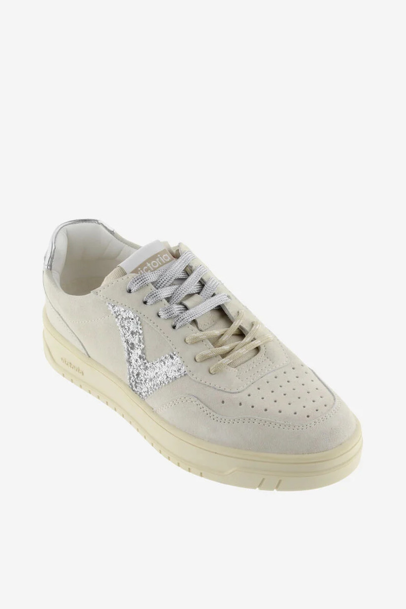 Una scarpa presente in ogni collezione Victoria. Stile semplice ma alla moda, che si abbina perfettamente ad ogni outfit. Sneaker modello SEUL in simil camoscio con dettaglio glitterato. Logo laterale glitter argento e tallone con il logo del marchio in colori coordinati. Punta traforata per favorire la traspirazione. Suola in TPR leggermente ambrata.